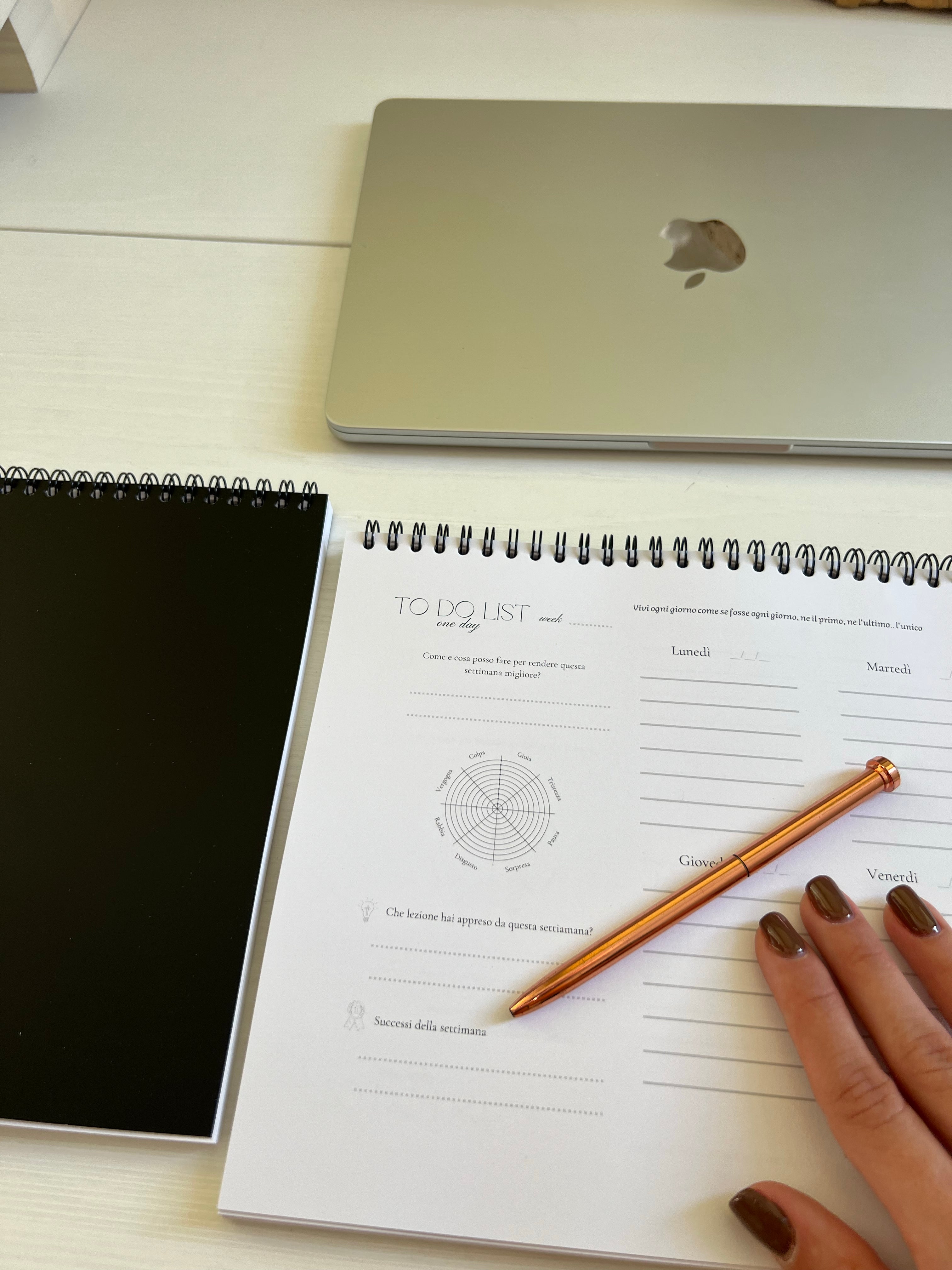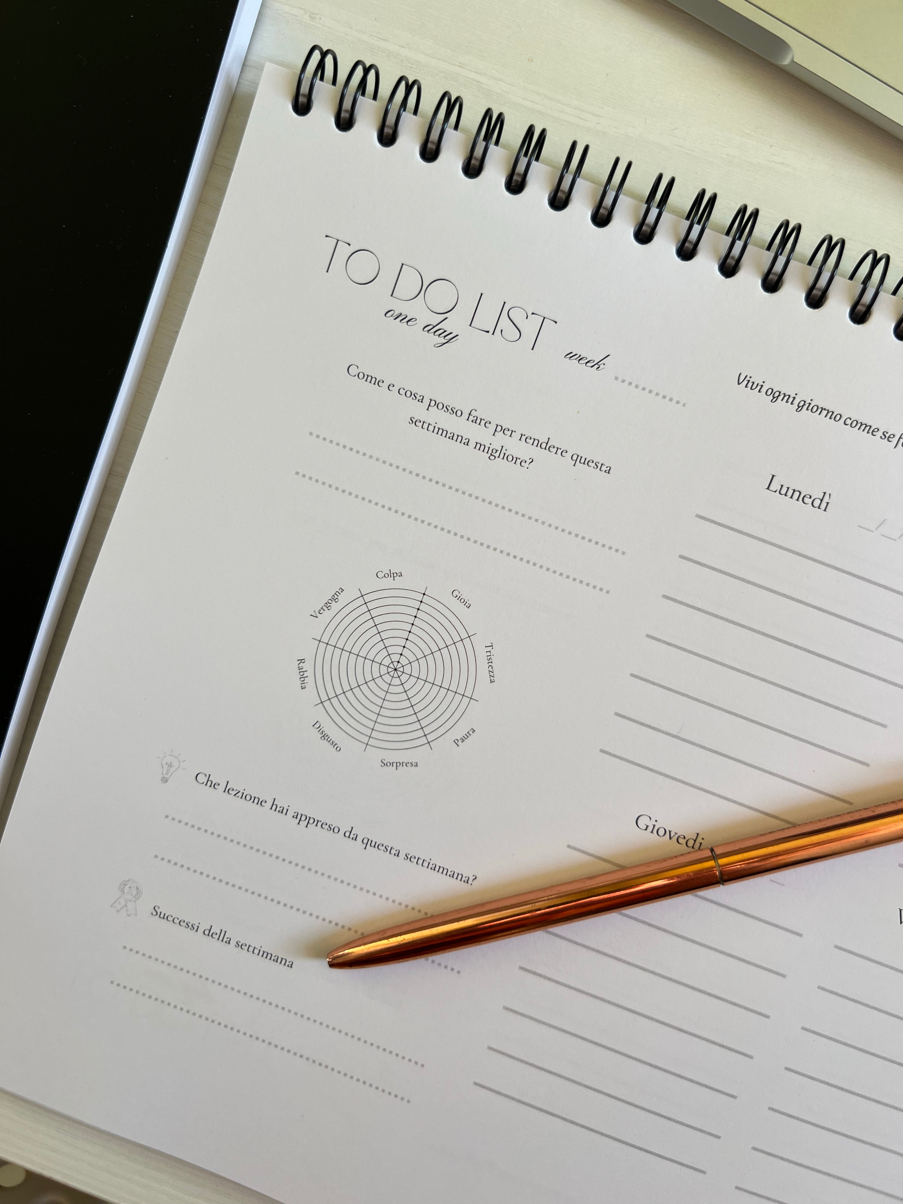 Il Planner Week è lo strumento perfetto per pianificare la tua settimana con equilibrio e consapevolezza. Oltre a gestire i tuoi impegni quotidiani, ti aiuta a riflettere sulle tue emozioni, celebrare i tuoi successi e imparare dalle esperienze vissute